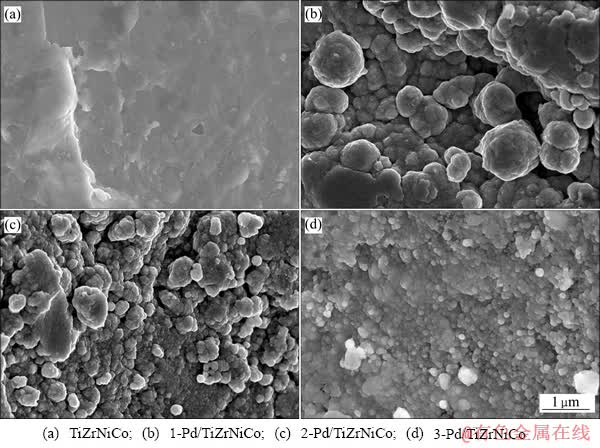 TiZrNiCo及Pd/TiZrNiCo的表面形貌如图2所示。图2(a)所示为未镀Pd的TiZrNiCo表面形貌,通过机械粉碎制得的合金颗粒的表面平整光滑。图2(b)所示为1-Pd/TiZrNiCo试样的表面形貌,表面Pd膜颗粒较大,直径可达1 μm。图2(c)所示为2-Pd/TiZrNiCo试样的表面形貌,表面Pd膜颗粒直径多为0.4 μm;图2(d)所示为3-Pd/TiZrNiCo试样的表面形貌,表面Pd膜颗粒较小,直径普遍小于0.2 μm。Pd颗粒尺寸由大到小的顺序依次为1-Pd/TiZrNiCo、2-Pd/TiZrNiCo、3-Pd/TiZrNiCo。
