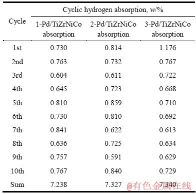 表1 1-Pd/TiZrNiCo、2-Pd/TiZrNiCo及3-Pd/TiZrNiCo在混合气体中的循环吸氢量