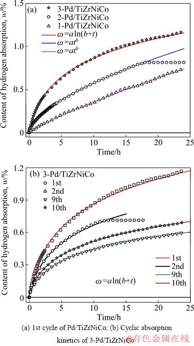 Pd/TiZrNiCo试样表面包覆Pd膜,表面活性较高,于混合气体中的吸氢动力学曲线可采用式(12)积分后的方程进行拟合,其结果如图9(a)所示(ω=atb及ω= aln(b+t)为式(3)积分后的形式)。