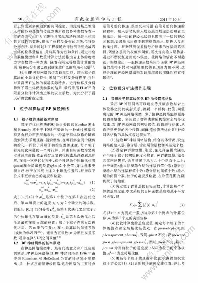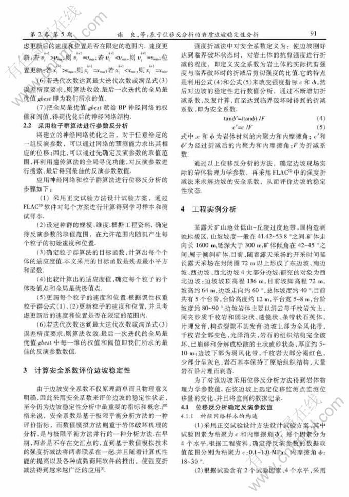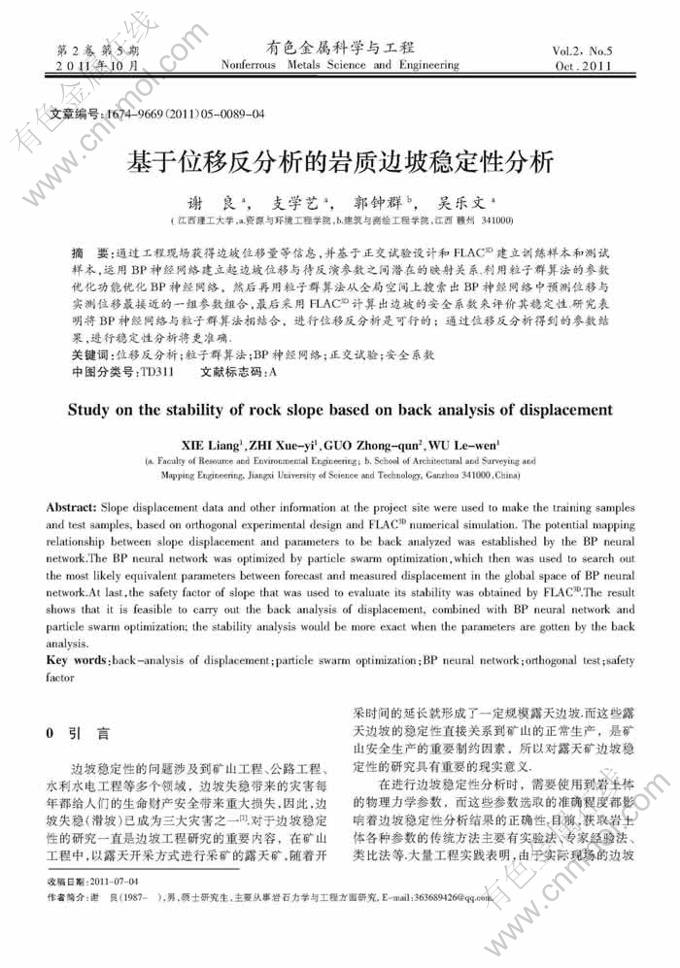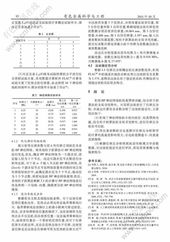 Key words:back-analysis of displacement; particle swarm optimization; BP neural network; orthogonal test; safety factor