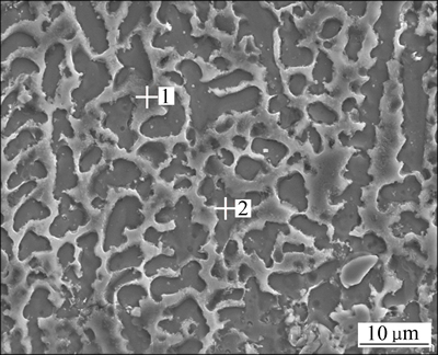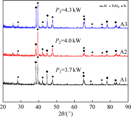 图3所示为激光熔覆涂层试样A1、A2和A3的XRD谱。从图3谱线可知,3种激光功率下的物相衍射峰位无明显差别,只是在衍射峰强上有所不同,激光熔覆涂层均由TiAl3、α(Al)和少量Si相组成,没有Ti的峰出现,表明Ti和基材中的Al已完全反应生成了TiAl3。观察熔覆层中上部的放大形貌(见图4)可知,激光熔覆涂层内生长有网状组织。图5所示为图4中对应点1和2位置处的EDS谱及其元素化学组成。分析图5所示的EDS元素化学组成结果,发现图4中对应点1处的Ti和Al原子摩尔比接近1:3,点2处的Al原子摩尔分数接近90%。因而可以推断,浅灰色的网状组织为TiAl3相(对应图4中点1),暗灰色的网状间隙组织为α(Al)相(对应图4中点2),Si则以晶须状生长在TiAl3和α(Al)相上,这与上面的XRD物相分析结果完全一致。证明了采用激光熔覆原位自生技术在ZL117高硅过共晶铝合金表面制备TiAl3金属间化合物增强Al基复合涂层是一种切实可行且有效的方法。