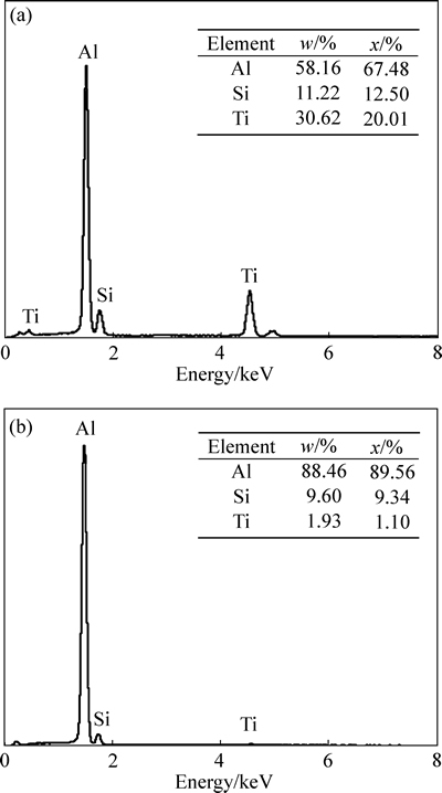 另外,由图1所示的Ti-Al二元相图可知,当Ti粉颗粒周围Al原子的摩尔分数达到76%时,Ti和Al在温度达到665℃时发生包晶反应生成TiAl3相,而生成的TiAl3相又被排斥到周围铝液中,形成Al-Ti-TiAl3平衡过度区。但这时的TiAl3相含量很少,形成的TiAl3相也不稳定,在激光束的快速加热和冷却过程中还将溶解于铝液。温度继续升高,熔池中Al原子和Ti原子活性增强,Ti原子和Al原子在两者界面位置反应生成TiAl3薄层。随着熔池中反应的进行,TiAl3含量增多,薄层不断增厚,TiAl3层中Ti原子和Al原子之间的相互扩散传质过程控制了二者之间的反应速度,而Al原子从TiAl3层中扩散出来与固态的Ti颗粒粉末接触并发生化学反应。与此同时,部分Ti原子也会通过热扩散行为透过TiAl3层与铝液中的Al发生反应生成TiAl3。根据文献[28],当Ti与Al发生反应且转化率达到0.2时,熔池中二者之间反应会自发进行;当转化率达到0.5时,会出现TiAl中间过渡产物,熔池中金属间化合物TiAl含量逐渐增多,从TiAl3层中热扩散来的Al原子将与TiAl进一步反应生成TiAl3。在熔池冷却过程中,由于Al和Ti完全反应,全部转化为TiAl3,此时熔池中的化学反应结束,所形成的TiAl3在冷却过程中不会再发生熔化,并能均匀地分散在ZL117基体上,最终将得到TiAl3和α(Al)的两相产物。
