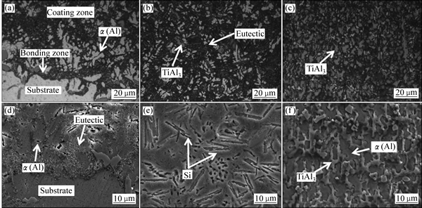 在高能密度激光束作用下,熔池中液态金属发生强烈对流,由于铝的熔点低,密度小,铝液向Ti熔体中流动,进而与预置粉末Ti发生反应生成金属间化合物TiAl3,使预置层与基材形成稀释率低且具有良好冶金结合的TiAl3金属间化合物增强Al基复合合金层。图6所示为A3试样激光熔覆涂层截面的显微组织。图6(a)、(b)和(c)所示为熔覆层组织形貌的OM照片。其中,图6(a)所示为熔覆层的结合区,白色枝晶为α(Al),灰黑色为铝硅共晶组织,基材和熔覆层形成了良好冶金结合;图6(b)所示为熔覆层底部,基体中的大块初生Si消失,以黑色针状形式存在于铝硅共晶组织中,且有少许灰白色块状组织TiAl3出现;图6(c)所示为熔覆层顶部,其中灰白色网状组织为TiAl3相,白色网状间隙组织为α(Al)相,而Si则以晶须状附生在TiAl3相和α(Al)相上。图6(d)、(e)和(f)所示分别为图6(a)、(b)和(c)对应位置的SEM像。