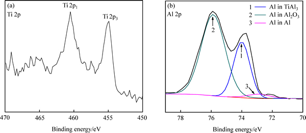 2) 相图分析和Gibbs自由能计算结果表明,TiAl3相比TiAl相稳定,在激光熔池的快速加热和冷却条件下,生成TiAl3相的可能性更大。XPS分析结果也证实,激光熔覆涂层中的Ti主要以TiAl3形式存在,Al则以TiAl3、Al2O3和Al的形式存在。