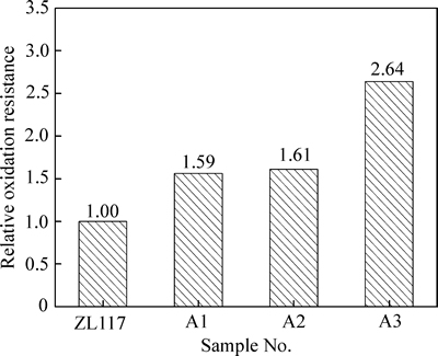 图9所示为ZL117铝合金和3种激光熔覆试样在600℃高温下的相对抗氧化值计算结果。通常相对抗氧化值越大,试样的高温抗氧化性能越好。从图9可以看出,相对于基体而言,激光熔覆层试样A3的相对抗氧化值最大,达到2.64,而激光熔覆试样A2和A1的相对抗氧化值分别为1.61和1.59。表明激光熔覆层试样具有较好的相对高温抗氧化性能,其中试样A3的相对高温抗氧化性能最好。由此可见,ZL117铝合金表面激光熔覆Ti-Al金属间化合物增强铝基复合涂层可大大降低了基体试样的氧化速率。