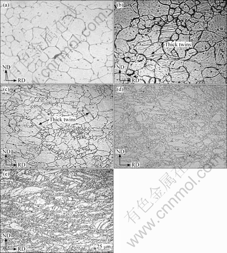 Fig.1 Optical micrographs showing microstructures of CRA (a) and HR AZ31 magnesium alloy sheets with reduction of 10% (b), 20% (c), 50% (d) and 65% (e)