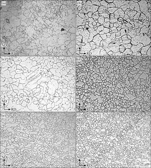 Fig.2 Optical micrograph showing microstructure of AZ31 magnesium alloy sheets annealed at 300 ℃ for 1 h after 10% (a), 20% (c), 30% (d), 50% (e), 65% (f) hot-rolling and 4 h after 10% hot-rolling (b)