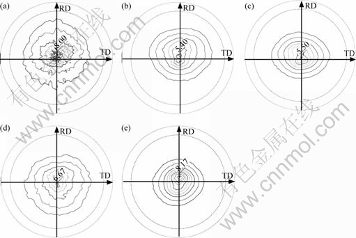 Fig.4 (0002) pole figures of CRA (a) and HR sheet with reductions of 10% (b), 20% (c), 50% (d) and 65% (e)