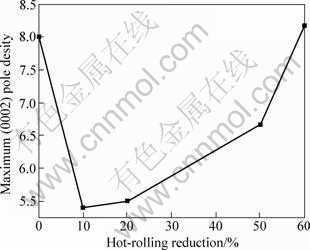 Fig.5 Influence of rolling reduction on maximum (0002) pole density of HR sheet