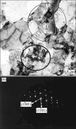 Fig.6 TEM image of subgrain microstructure in 60% HR sheet (a) and corresponding SAED pattern of A zone (b)