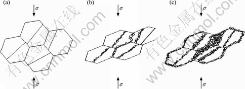 Fig.7 Formation models for fragmentation morphologies of grains: (a) Formation of thin twins; (b) Recrystallization within twinned region and near grain bounders; (c) Grain fragmentation