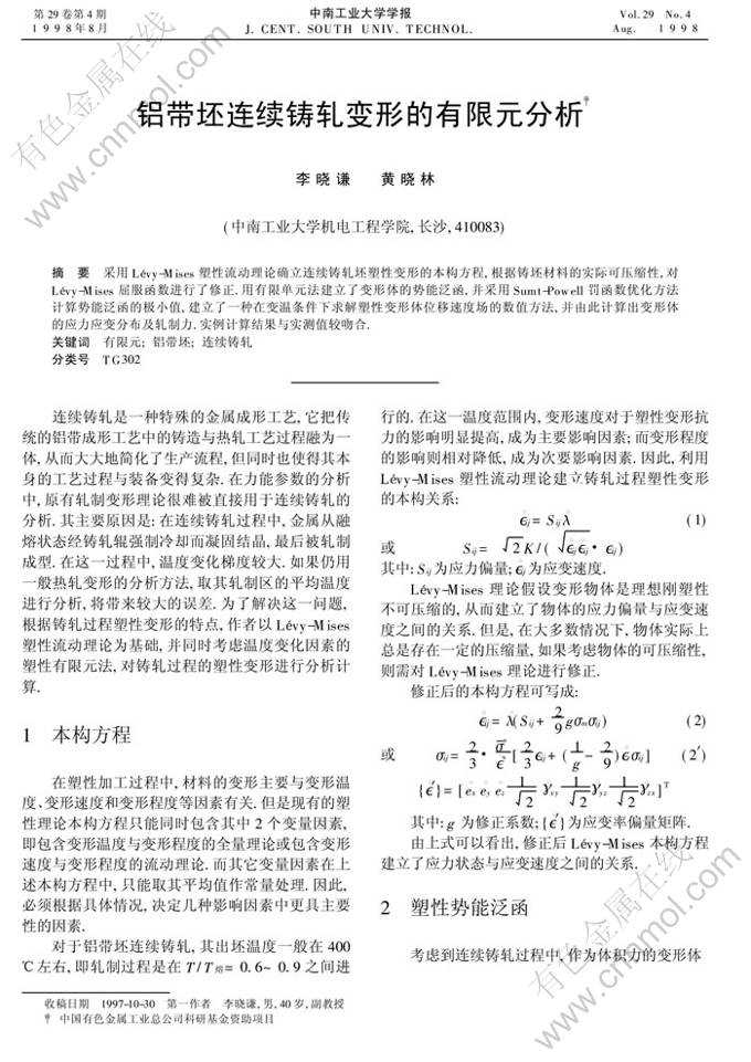 摘 要:采用Lévy-Mises塑性流动理论确立连续铸轧坯塑性变形的本构方程,根据铸坯材料的实际可压缩性,对Lévy-Mises屈服函数进行了修正.用有限单元法建立了变形体的势能泛函,并采用Sumt-Powel罚函数优化方法计算势能泛函的极小值,建立了一种在变温条件下求解塑性变形体位移速度场的数值方法,并由此计算出变形体的应力应变分布及轧制力.实例计算结果与实测值较吻合.