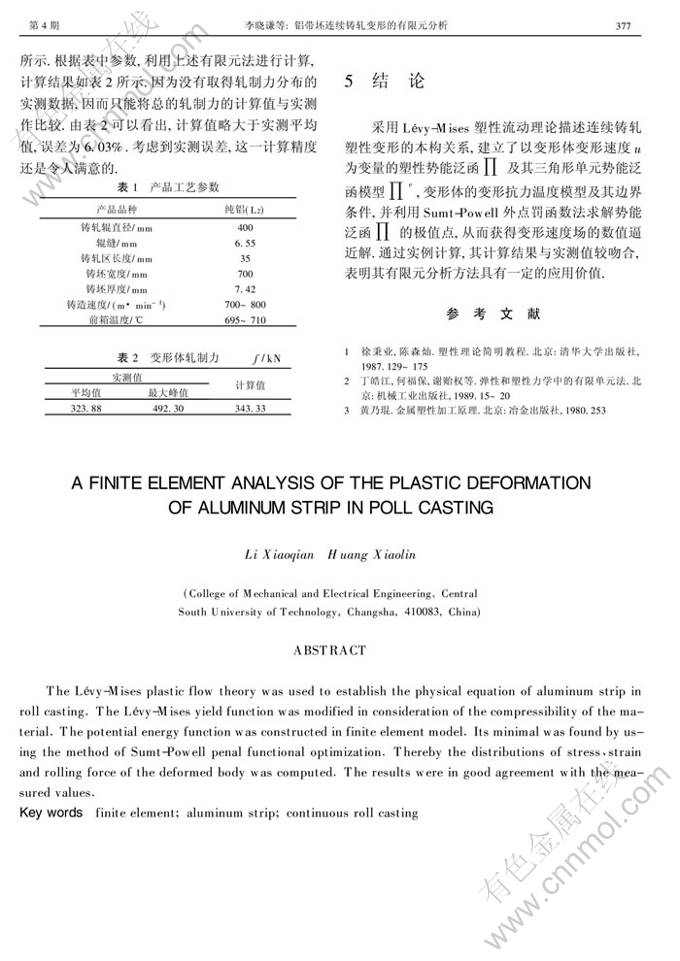 Abstract: The Lévy-Mises plastic flow theory was used to establish the physical equation of aluminum strip in roll casting. The Lévy-Mises yield function was modified in consideration of the compressibility of the material. The potential energy function was constructed in finite element model. Its minimal was found by using the method of Sumt-Powell penal functional optimization. Thereby the distributions of stress、strain and rolling force of the deformed body was computed. The results were in good agreement with the measured values.