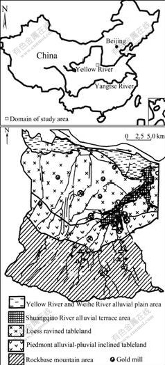 Based on its geochemical landscape characteristics, the region is divided into five areas, the rock base mountain area, loess ravined tableland, piedmont alluvial-pluvial inclined tableland,Shuangqiao River alluvial terrace area, and Yellow River and Weihe River alluvial plain area. In the rock base mountain area, there are lots of gold ores and several gold mines (Fig.1). However, there is few soil, so it is suitable for agricultural activity and not included in the studied area, and the other four areas were selected as studied region. Among these four areas, Yellow River and Weihe River alluvial plain area is the only one which is occupied mainly by agricultural activities, and the others are cooperated in mixtures of agricultural and gold-mining activities. Although agricultural activities are conducted all over the other three, most of them are condensed in the area close to Tongguan county.