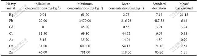The Pb concentrations (about 3 450 mg/kg) (between the minimum and maximum values) was the largest, and its variation (Standard deviation=487.83), mean (216.93 mg/kg) and mode (32.00 mg/kg) were also the highest of all the studied samples. This suggests that there are several locations having great Pb concentrations, and the soils have been contaminated more severely by this metal. The ratios of mean to background value for most metals, except Cr and As, are larger than 1.0, and are ranked in following order: Hg>Pb>Cd>Cu>Zn. This means that the human activities have significant effects on the concentrations for almost metals in soils over this studied region, and the soil is polluted by these metals.