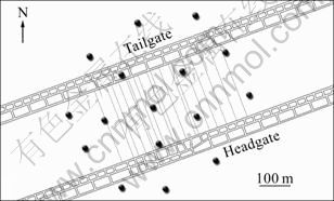 The seismic data used in this work were collected by National Institute for Occupational Safety and Health (NIOSH) in a coal longwall mine in western United States [16]. The mining-induced microseismic events during eighteen days were recorded by sixteen mounted receivers on the surface, above the active panel. The locations of longwall face in each day, panel geometry and location of the mounted receivers on the surface are shown in Fig. 3. In this mine, the average annual mining production is 7.5×106 t. The overburden is approximately 350 m, and the coal seam thickness ranges from 2.6 m to 3.0 m. The coal seam is overlain and underlain by sandstone with 2 m and 35 m in thickness, respectively. The length and width of interested panel are approximately 5 490 m and 250 m, respectively. The adjacent panel in tailgate already is mined, but the mining operation in the adjacent panel in headgate has not yet started. The mining operation in the panel under study is retreated longwall mining method. Over the course of data recording, the face is retreated for about 431 m, so about 24 m per day in average [9, 16-17].