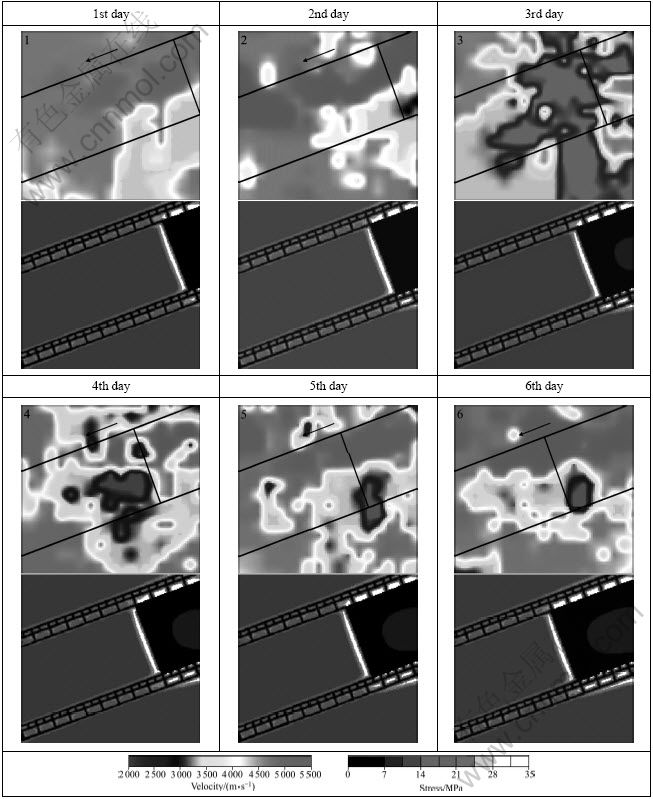 Fig. 5 Two-dimensional seismic velocity tomograms and numerical plots of stress (1-6 d)
