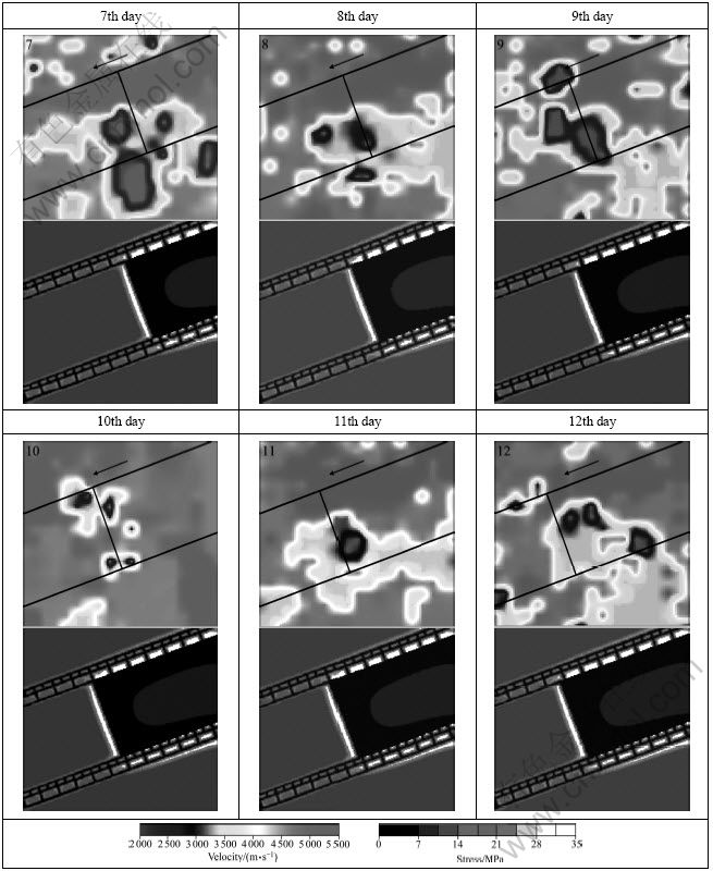 Fig. 6 Two-dimensional seismic velocity tomograms and numerical plots of stress (7-12 d)