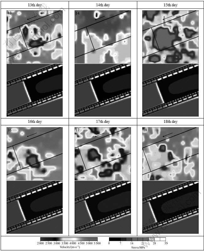 Fig. 7 Two-dimensional seismic velocity tomograms and numerical plots of stress (13-18 d)