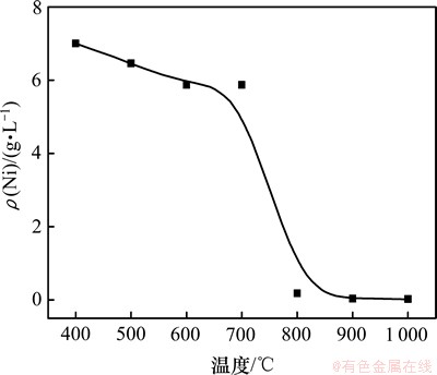 煅烧温度不同使得样品的晶体结构存在差异,其外观、颗粒的形貌、结晶度、晶粒尺寸、微观应变均不同,从而影响样品的性能。在总氨浓度3.5 mol/L,n(NH3)/n(NH4+)为2:3,温度为25 ℃ 条件下,研究不同煅烧温度下获得NiSiO3的溶解平衡,结果见图5。
