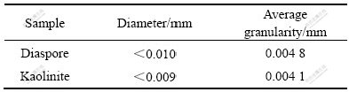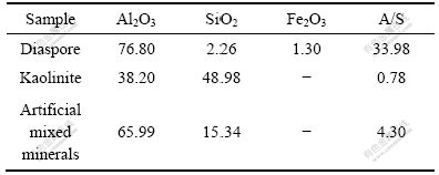 实验所用的一水硬铝石和高岭石矿样分别取自河南巩义和山西孝义。块矿经手碎、手选后再用破碎机破碎,最后经周期式搅拌球磨机磨细,得到实验矿样。试样粒度见表1,化学分析结果见表2。人工混合矿样的铝硅比为4.30,其中一水硬铝石占78%、高岭石占22%。