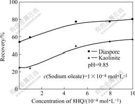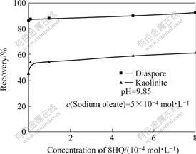 2.2 油酸钠为捕收剂时8-羟基喹啉对一水硬铝石和高岭石浮选的影响