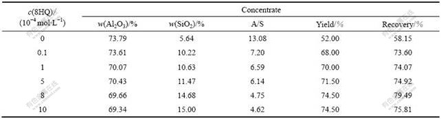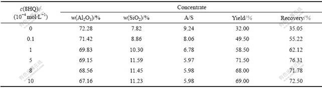 从表3和表4可见,当8-羟基喹啉用量较低时(c(8HQ)=1×10?5 mol/L),人工混合矿的回收率明显提高。在油酸钠用量为1×10?4 mol/L,8-羟基喹啉用量为1×10?5 mol/L时,人工混合物精矿的回收率从35.05%增加到55.22%,铝硅比仅从9.24降低为8.06;8-羟基喹啉用量相同时,当油酸钠的用量增至5×10?4 mol/L时,精矿回收率也有明显增加,但铝硅比降低,铝硅分离的选择变差。