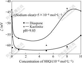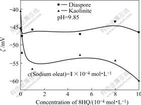 图6和图7所示为在pH=9.85下加入8-羟基喹啉后矿物的ζ电位变化图。在两个不同的油酸钠用量下,当8-羟基喹啉的用量小于5×10?4 mol/L时,高岭石的ζ电位均随着8-羟基喹啉的用量的增大而负移,其负移量也基本一样。而一水硬铝石的情况却不一样,当油酸钠用量为1×10?4 mol/L时,一水硬铝石的ζ电位基本不受8-羟基喹啉用量变化的影响,而油酸钠用量增至5×10?4 mol/L时,随8-羟基喹啉用量的增加,一水硬铝石的ζ电位负移。这说明8-羟基喹啉在铝硅矿物表面吸附的模式可能不同。当油酸钠用量为5×10?4 mol/L,8-羟基喹啉的用量大于5×10?4 mol/L时,从实验可以明显看到铝硅矿物经药剂作用后迅速沉下来,这说明矿物发生强烈的疏水聚团,所以测出来的ζ电位可能不是矿物的ζ电位。
