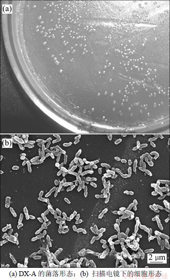 图1 DX-A的菌落形态和扫描电镜下的细胞形态 (10 000×)