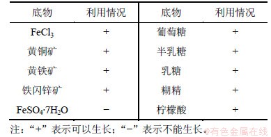 实验表明DX-A最适生长温度为30 ℃,最适生长pH为3.5,如图2所示。菌株DX-A不仅能利用FeCl3、黄铜矿、黄铁矿、铁闪锌矿进行自养生长,而且可以利用葡萄糖、半乳糖、乳糖、糊精、柠檬酸进行异养生长,但不能利用FeSO4进行生长,如表1所示,因而该菌为兼性异养型细菌。