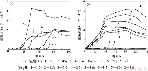 用稀H2SO4将9K+1%葡萄糖液体培养基调至不同pH,接种量相同,摇床培养,每隔一段时间用血球计数板计数,测定不同初始pH下细菌生长情况。