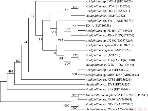 (2) 菌株DX-A的16S rDNA序列长度为1 309 bp,Genbank核酸序列登录号为EU710758。16S rDNA系统发育树的构建表明,DX-A菌株与Acidiphilium sp. PK46(AY765995)位于系统发育树同一个分支中,相似度为99%,初步判定菌株DX-A属于Acidiphilium sp.。