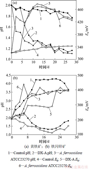 接种菌株DX-A体系液相Eh值(氧化还原电位)在短暂滞后期后快速上升,而接种A. ferrooxidans ATCC23270体系液相Eh值不呈现滞后期;而对照组Eh值上升幅度不大,如图4(a)所示。