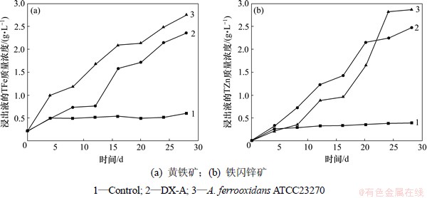 (3) 菌株DX-A分别浸出黄铁矿和铁闪锌矿28 d后,含菌的摇瓶的Fe2+和Zn2+的质量浓度分别可达到2.36 g/L和2.47 g/L,菌株 DX-A和 A. ferrooxidans ATCC23270混菌浸出黄铁矿和铁闪锌矿分别比A. ferrooxidans ATCC23270单菌浸出效果高2.7%和10.3%,这表明该菌能够浸出黄铁矿和铁闪锌矿并能促进自养菌浸矿。若对该菌进一步驯化,则有望更好地促进自养菌的浸矿。