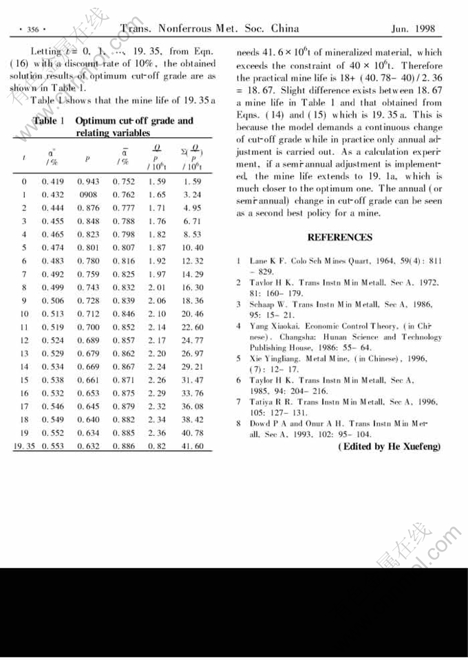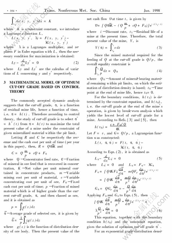 Abstract: A new method for the optimization of cut-off grade in open-pit was put forward, which was based on control theory. After a brief introduction to the analytical framework of calculus of variations with an overall equality constraint, a mathematical model for selecting an optimum cut-off grade function was constructed, which aimed at the maximization of total present value of an open-pit. Then a comparison was made, and it was shown that the new method yielded the same solution results as the traditional ones, and in some cases it avoided the iteration process which was needed by those traditional methods due to the mutural determination of cut-off grade and the maximum total present value of a mine. At last a calculation example was given.