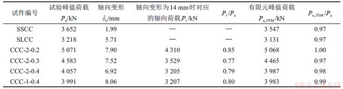 5) CCC试件在偏压荷载作用下的轴向荷载-变形曲线特征与其对应的CFST短柱轴压曲线特征相似,即超过峰值荷载后,承载力急剧下降,在轴向变形达12~14 mm处,曲线出现拐点,继续加载,试件残余承载力基本维持稳定。取△为14 mm处的轴向荷载为试件的残余荷载,CCC试件的残余荷载相对峰值荷载的比值约为79%。但在CCC-2-0.2试件中,该比值相比其他试件的比值高,这可能与其破坏位置有关。