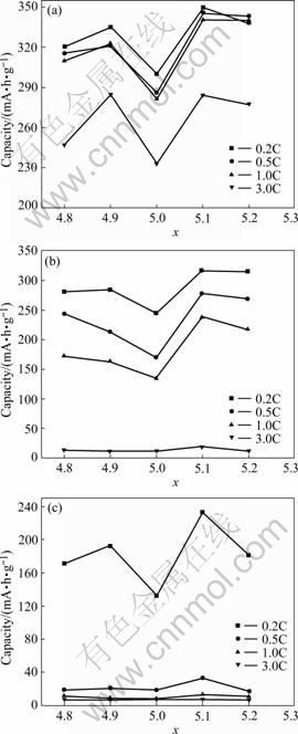 Fig.1 shows the variation of the discharge capacity, versus the value of x of the ABx alloy. It can be seen that with the increase of x, the discharge capacities curves of various rates (0.2C, 0.5C, 1C, 3C) at 20 ℃ and -20 ℃, as well as that of 0.2C at -40 ℃, present the shape of character M. Over-stoichiometric alloys and under- stoichiometric alloys exhibit better high-rate discharge capability and low-temperature performance compared with that of the stoichiometric alloy (x=5.0). The alloy with x=5.1 shows the excellent electrochemical capability, of which the 3C discharge capacity reaches 284 mA?h/g at 20 ℃, and 0.2C also reaches 233 mA?h/g at -40 ℃.