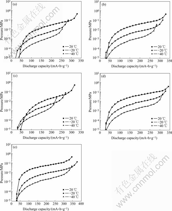 The pressure-composition-temperature(P—C—T) curves measured at 20, -20 and -40 ℃ are shown in Fig.4.