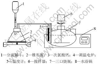 本实验用到的实验试剂主要包括草酸、次氯酸钙、盐酸、氯化钴、去离子水等。其中草酸、盐酸和氯化钴为分析纯,次氯酸钙为化学纯。实验装置如图1所示,左边是由分液漏斗、锥形瓶和调温电炉组成的氯气发生部分,右边是由电热恒温水浴锅、数显恒速搅拌机、温度计和三颈瓶组成的氧化部分,实验装置置于通风橱中。