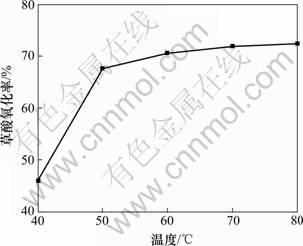 从理论上讲,反应温度直接影响反应的反应速度。一般来说,在低温时反应速度较慢,当温度升高时,分子的热运动速度加快,分子的碰撞概率增加,有利于反应过程的进行。实验探讨了在次氯酸钙150 g,6 mol/L盐酸550 mL以及搅拌速度为400 r/min和反应时间为2 h的条件下,反应温度分别为40,50,60,70和80 ℃时对草酸氧化率的影响,以确定合适的反应温度。实验结果如图2所示。