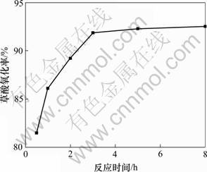 从图2可以看出:草酸的氧化率随着反应温度的升高而增大。草酸的氧化反应是吸热反应,因而随着反应温度的升高,反应平衡向正方向移动,草酸的氧化率增加。只是在反应温度超过50 ℃以后,草酸的氧化率随反应温度升高而增大的幅度有所降低。综合考虑以上因素,反应温度选择50 ℃比较合适。