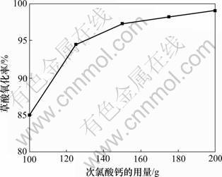 从图4可以看出:氯气的用量越大,草酸的氧化率越高;在次氯酸钙的量超过150 g之后,虽然草酸氧化率变化的总趋势是增加的,但是,其增加的递增幅度逐步减低;随着氯气用量的增加,单位时间溶液中溶解的氯气量也相应增加,从而增加了溶液中氯气的浓度,反应平衡向正方向移动,因此,草酸的氧化率增加。随着草酸氧化反应的进行,溶液中生成物(Cl-)浓度增加,阻碍了反应向右进行,在宏观的体现就是随着氯气量的增加,草酸的氧化率增加幅度降低。经综合考虑,制备氯气的次氯酸钙选择150 g比较合适,按理论反应折算成产生氯气量为149 g。