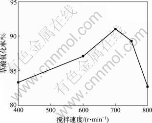 搅拌可以为体系提供能量,强化传质,使反应物料充分混合,避免浓度梯度和温度梯度的产生,保证体系与环境的高度一致,有利于气体均匀分布于溶液中,提高气体通过气液膜扩散到溶液中的速度。实验探讨了在次氯酸钙150 g,6 mol/L盐酸550 mL以及反应时间为3 h和反应温度为50 ℃的条件下,搅拌速度分别为400,600,700,750和800 r/min时溶液中草酸的氧化率的影响,以确定合适的搅拌速度,实验结果如图5所示。