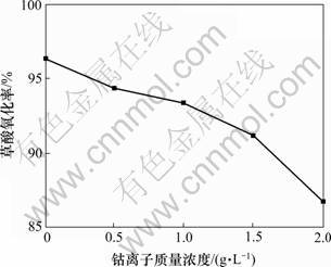 实验探讨了在溶液中草酸 20 g/L、盐酸1.0 mol/L、次氯酸钙150 g、6 mol/L盐酸550 mL以及反应时间为3 h、反应温度为50 ℃和搅拌速度为700 r/min的条件下,溶液中钴离子质量浓度分别为0,0.5,1.0,1.5和2.0 g/L时对母液中的草酸的氧化率的影响,实验结果如图6所示。