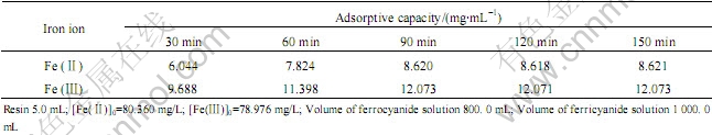 实验温度为298 K,量取5 mL树脂两份置于不同的烧杯中,分别加入铁氰化溶液和亚铁氰化溶液,取样分析,测得一系列相应时间下树脂的吸附容量,如表1所列。