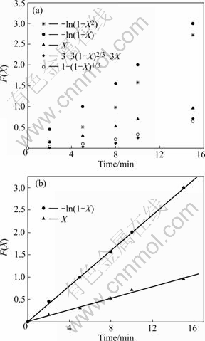 Fig.2  Tests of kinetic model equation F(X) vs time defined by equations for [Fe(CN)6]3- (Resin 5.0 mL; [Fe(Ⅱ)]0=84.690 mg/L; T=298 K; Volume of solution 600.0 mL)