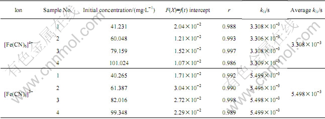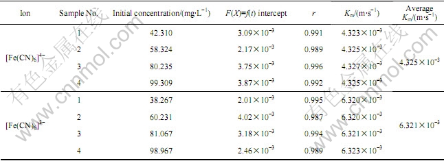 由表2和3中的线性回归结果可以看到,该吸附过程可以用这两个方程进行描述,并通过直线斜率可计算得到物质传递系数Km和吸附速率常数k1i,所以可以确定树脂对[Fe(CN)6]3-和[Fe(CN)6]4-的吸附过程是由液膜扩散为控制步骤的。表2和3中已得到液膜扩散控制的吸附过程中的Km和k1i,对于[Fe(CN)6]4-和[Fe(CN)6]3-离子的吸附速率常数分别为3.308×10-3和5.498×10-3/s,物质传递系数Km分别为4.325×10-3和6.321×10-3 m/s。