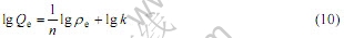 分别量取2、4、6、8和10 mL树脂各两份置于不同的烧杯中,分别加入铁氰化溶液和亚铁氰化溶液,实验条件为:[Fe(Ⅱ)]0=79.267 mg/L,[Fe(Ⅲ)]0=82.015 mg/L,T=298 K,总溶液体积800.0 mL。用著名的Freundlich 等温吸附方程进行线性拟合分析[7]: