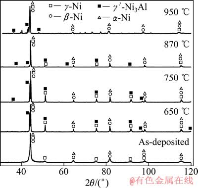 2) 沉积态NiCrAlY涂层由γ-Ni、β-NiAl及α-Cr 相组成,真空热处理过程中涂层发生β→γ′→γ相转变,γ′分布于β晶界或γ晶粒内,经650 ℃真空热处理后,涂层析出γ′-Ni3Al相;当真空热处理温度为750 ℃时,其含量增加;当温度进一步提高至870 ℃或950 ℃时,发生γ′→γ相转变导致γ′相含量明显减少。
