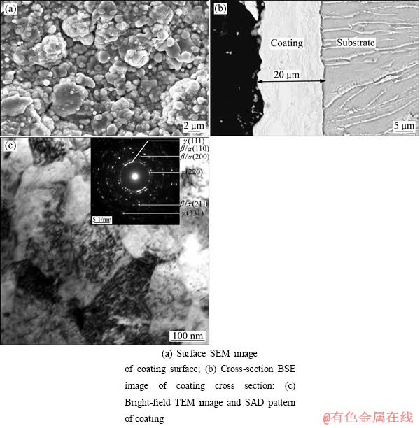 在本实验中,从宏观上来看,沉积态电弧离子镀NiCrAlY涂层表面光洁平整,呈灰白色金属光泽,其显微结构如图2所示。由图2(a)可知,涂层表面由直径约为1~3 μm细小颗粒堆积而成,部分颗粒堆积成粗大粒子在涂层表面形成突起。由图2(b)可知,涂层连续致密、不含孔隙、气孔或裂纹等沉积缺陷,与钛合金基体结合紧密,涂层/基体界面平整,涂层厚度约为20 μm;但是在微观结构上,涂层表面凹凸不平,其内部呈现灰、白色层交替出现的层状结构。LI等[19]认为灰色相为防护性能较佳的富铝β-NiAl相,白色基体相为相对贫铝γ-Ni或γ′-Ni3Al相。为进一步研究沉积态NiCrAlY涂层的微观结构和相组成,对沉积态NiCrAlY涂层试样进行透射电镜(TEM)观察。图2(c)为沉积态NiCrAlY涂层TEM明场相及选区衍射(SAD)斑点(插图)。由图2(c)可知,沉积态NiCrAlY涂层为多晶结构,由γ-Ni、β-NiAl及α-Cr相组成(插图),其平均晶粒尺寸为200 nm左右。涂层多晶晶界并不明显,这与沉积态NiCrAlY涂层中存在残余应力有关。涂层中残余应力的存在对涂层的使用寿命是不利的,特别是在热暴露环境中(如高温静态和循环氧化等)残余应力的存在容易导致涂层开裂、剥落而失效。沉积残余应力普遍存在于物理气相沉积涂层中,一般来说,可以通过适当的真空热处理来消除涂层中的残余应力,促进元素的扩散和再分布,获得涂层与基体的冶金结合[2, 20]。